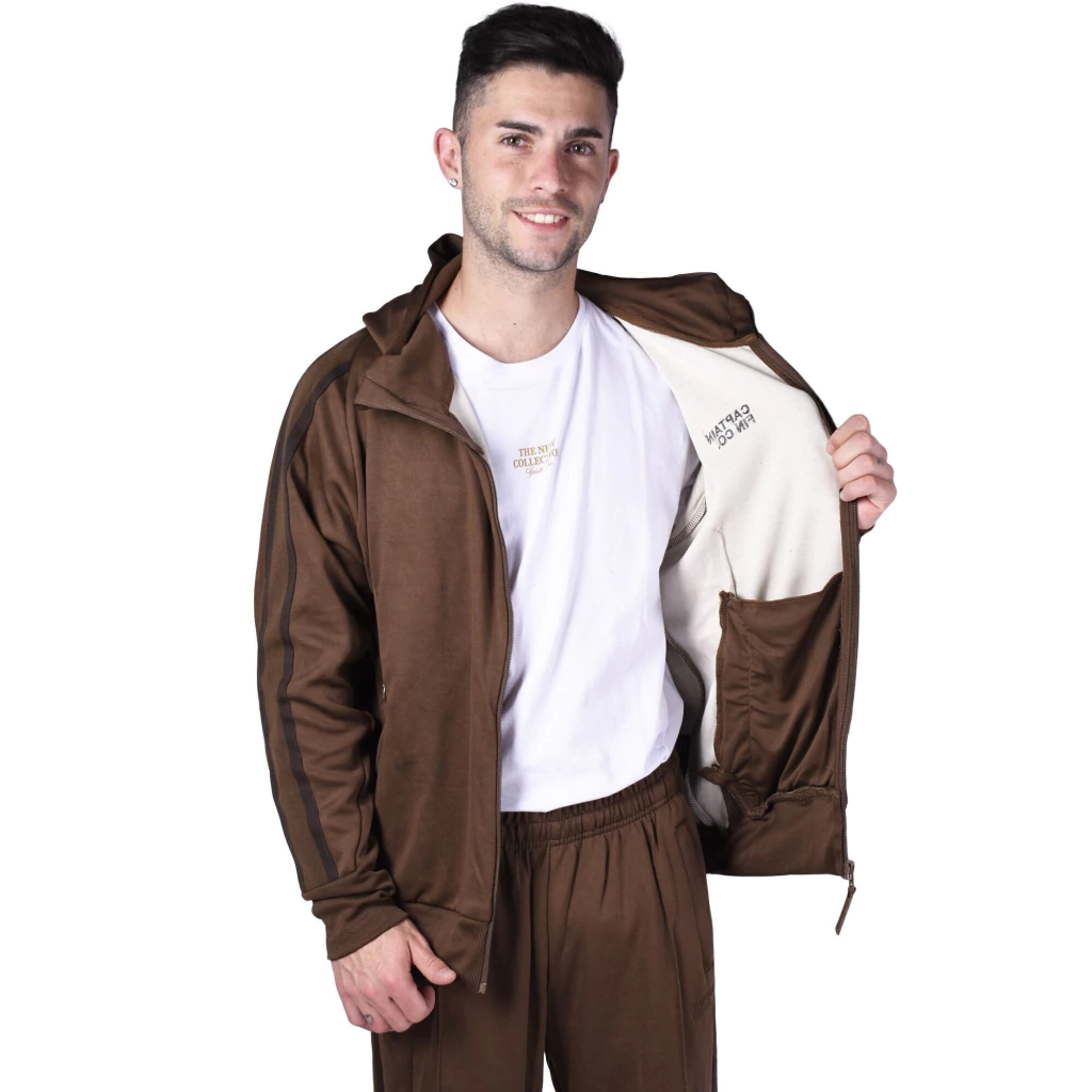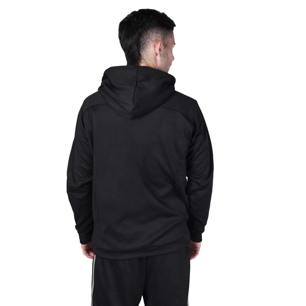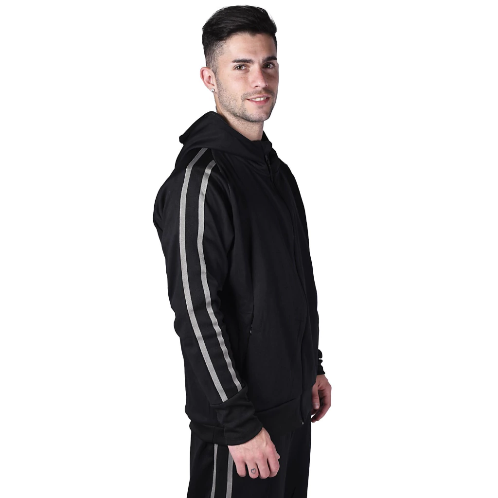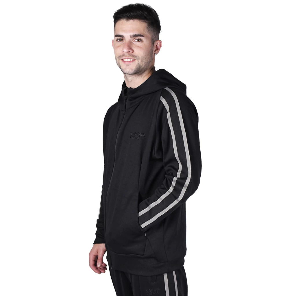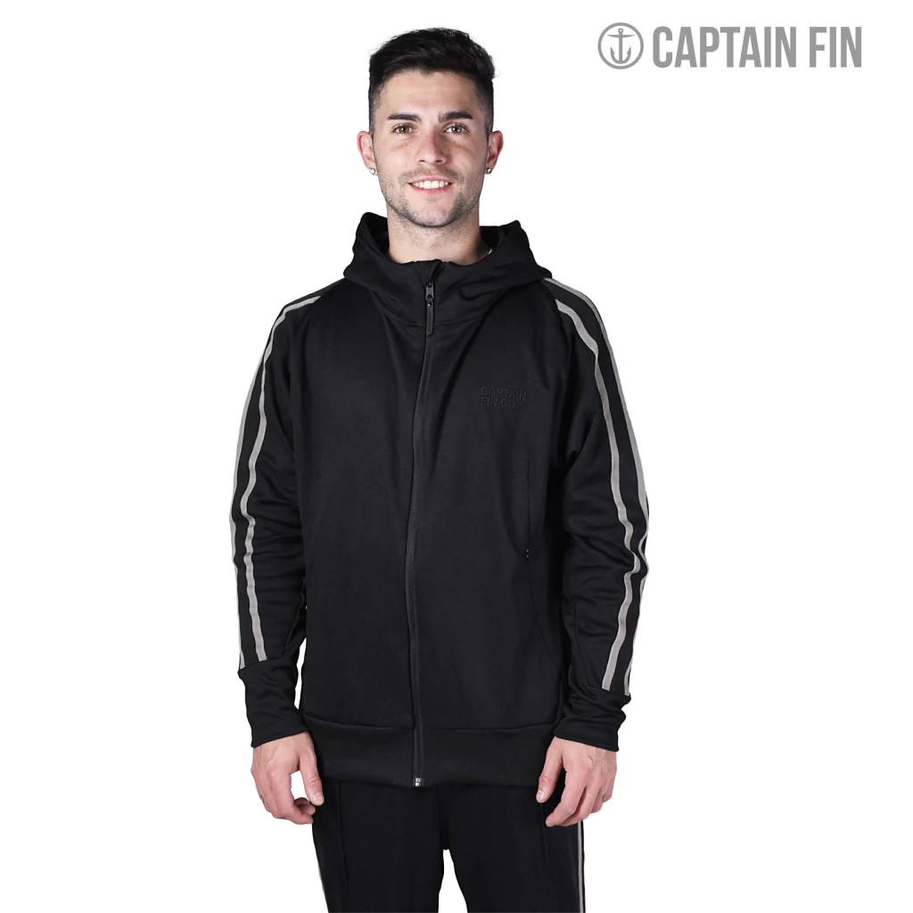 Campera con cierre y capucha composición 100% poliéster. Bolsillos laterales con cierre invisible, cinta tejida al tono en las mangas, puños y pretina de ribb con diseño irregular y bordado al tono en delantero.