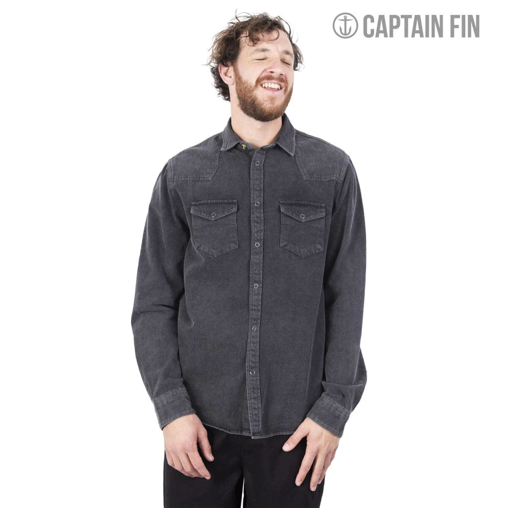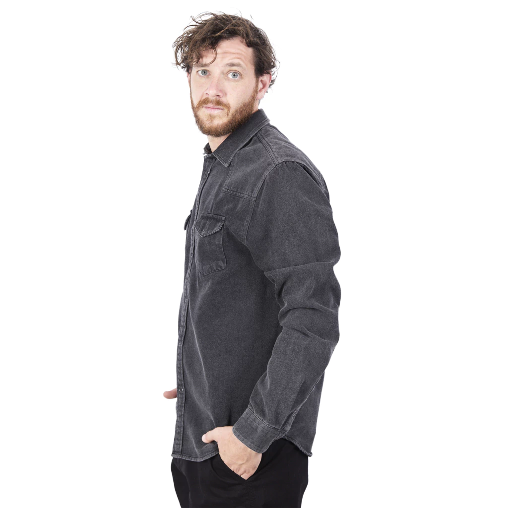 CAMISA MANGA LARGA DE DENIM CON LAVADO DESGASTADO, ETIQUETA DE MARCA TEJIDA EN EL DELANTERO, BOTONES A PRESIÓN Y PRIMER BOTÓN CON GRABADO DE MARCA. AVIOS PERSONALIZADOS. COMPOSICIÓN: 100% ALGODÓN.
