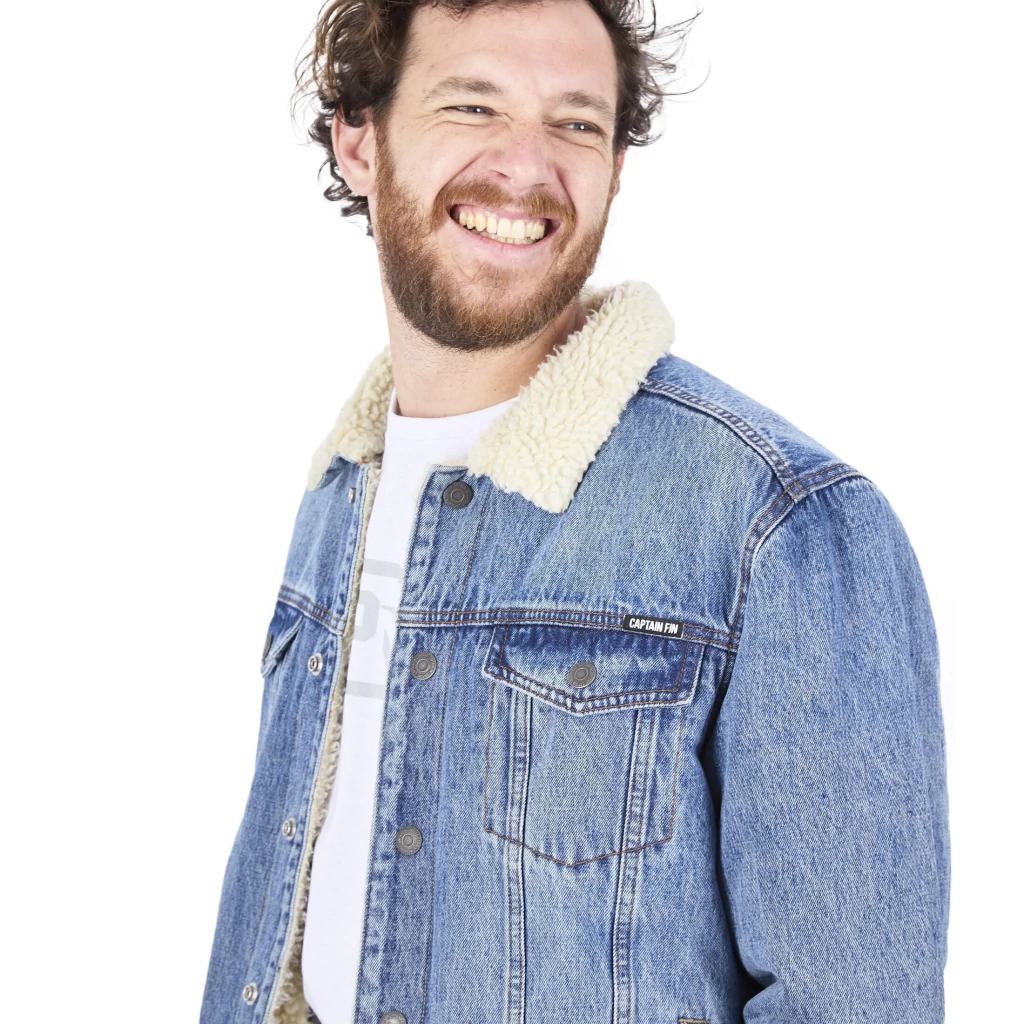 Campera de jean con interior de sherpa y tejido de poliéster. Botones a presión y avíos personalizados.