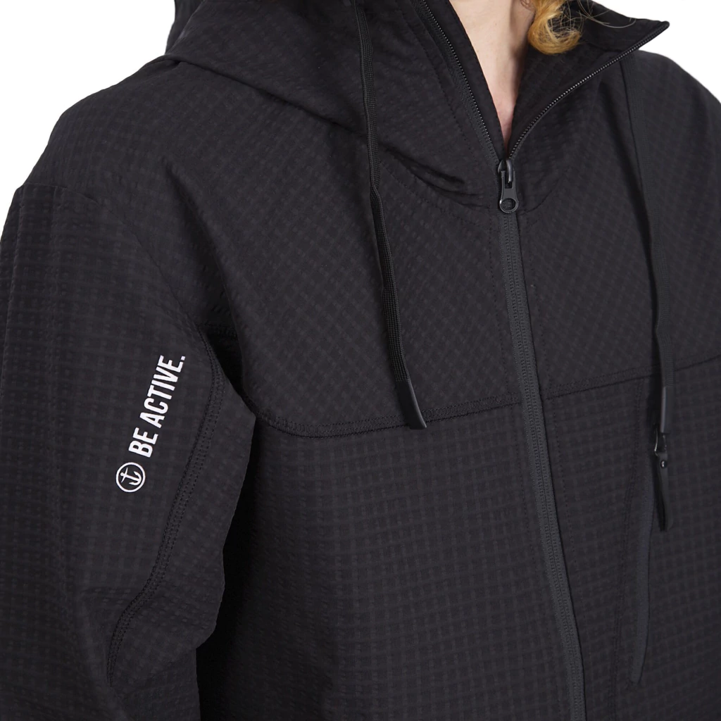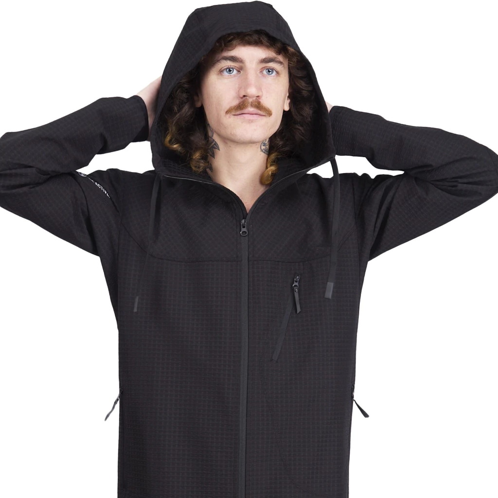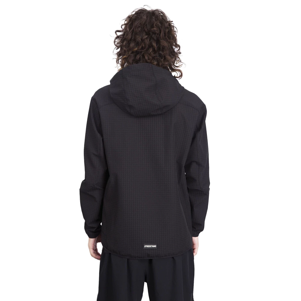 Campera rompevientos de tela diferenciada composición 90% poliéster - 10% elastano. Cierre principal y tres bolsillos frontales con cierre reverso y tiracierres personalizado, capucha regulable con cordón y ojales vinílicos. Detalle de estampa en 3d reflectiva en manga y etiqueta de goma en espalda.