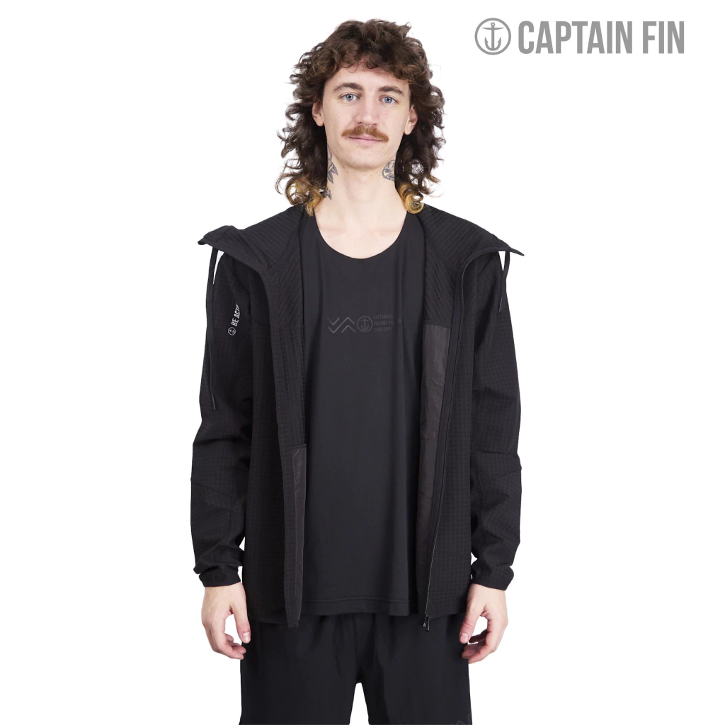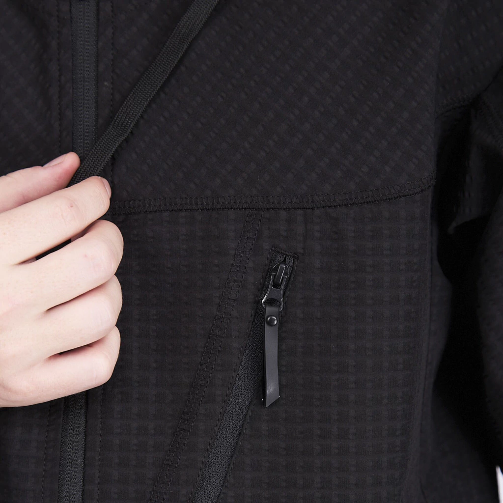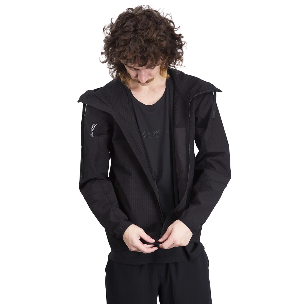 Campera rompevientos de tela diferenciada composición 90% poliéster - 10% elastano. Cierre principal y tres bolsillos frontales con cierre reverso y tiracierres personalizado, capucha regulable con cordón y ojales vinílicos. Detalle de estampa en 3d reflectiva en manga y etiqueta de goma en espalda.