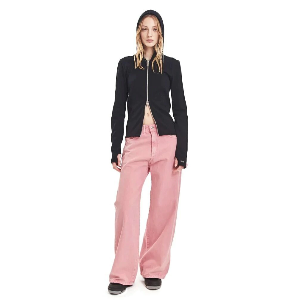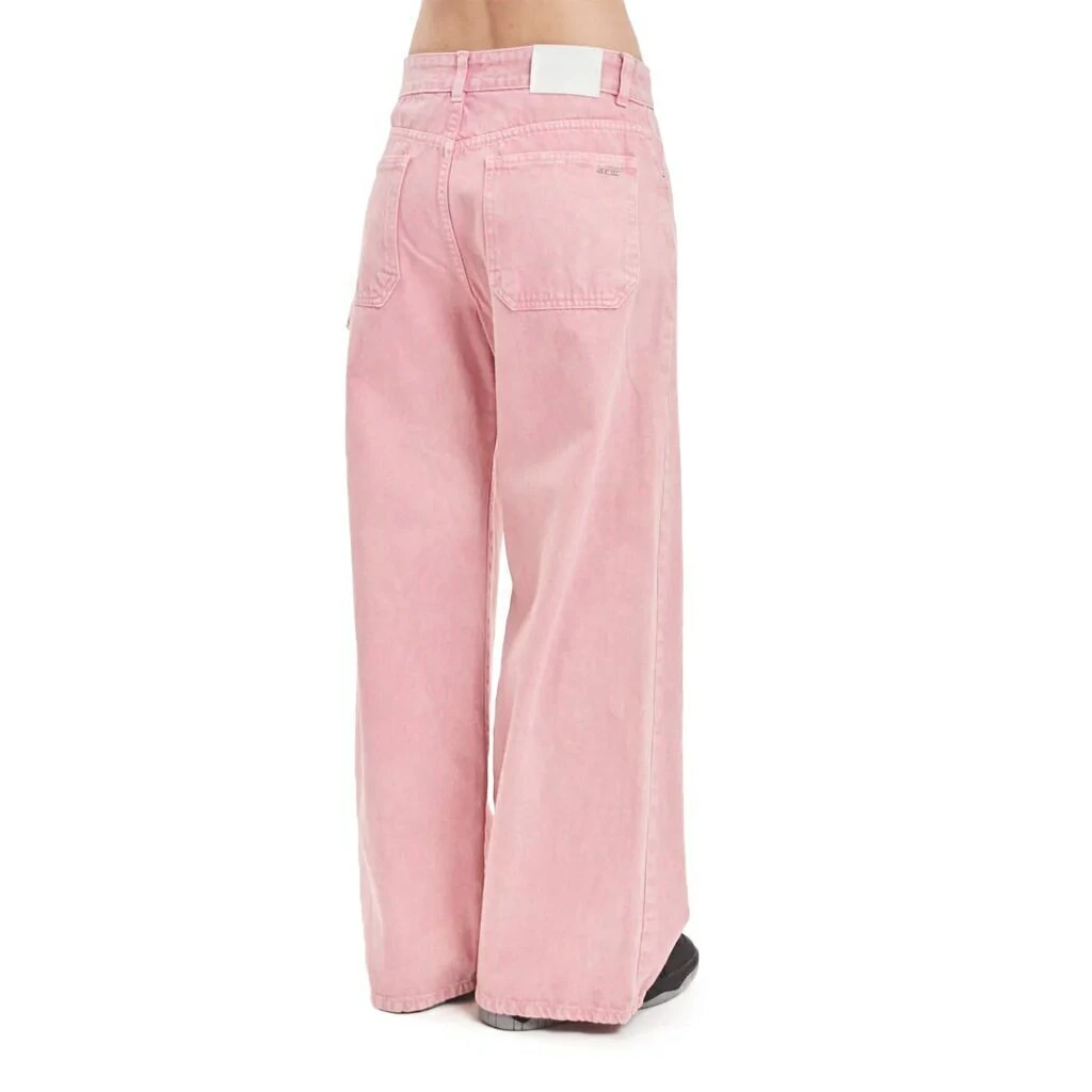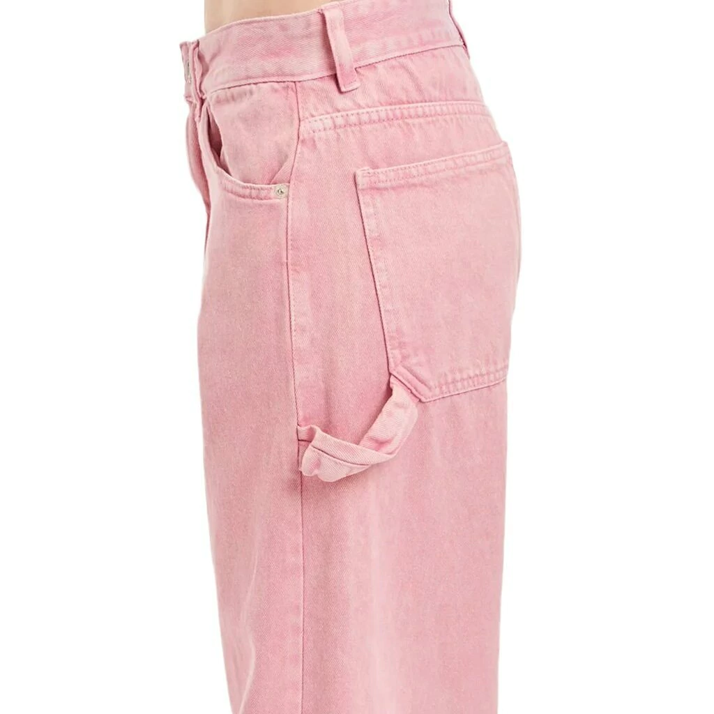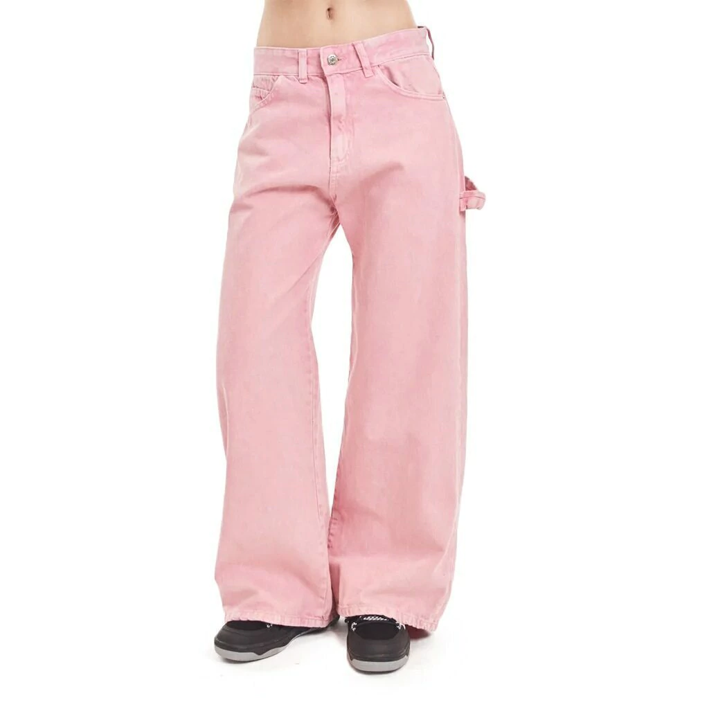 Jean 5 bolsillos en color rosa, calce relax con piernas extra amplias. Tira carpintera lateral.
