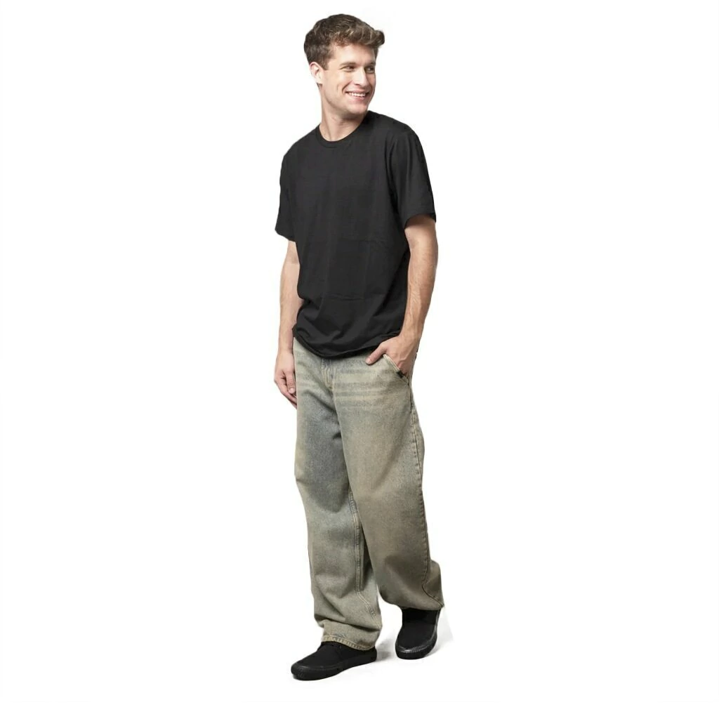Denim rígido con calce extra baggy fit. Bolsillos delanteros rectos. Bolsillo trasero XL con etiqueta de marca. Badana de eco cuero. Botón y remaches color bronce italiano.