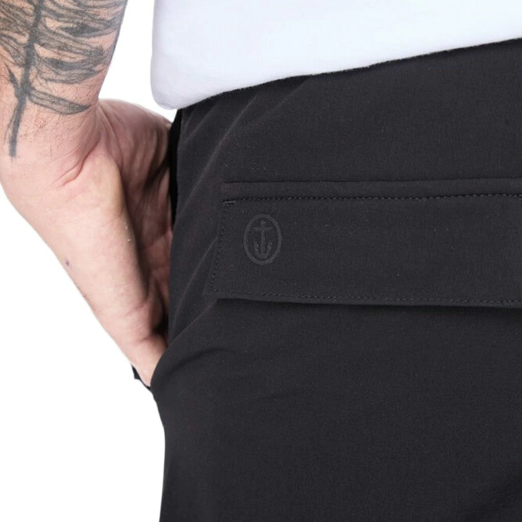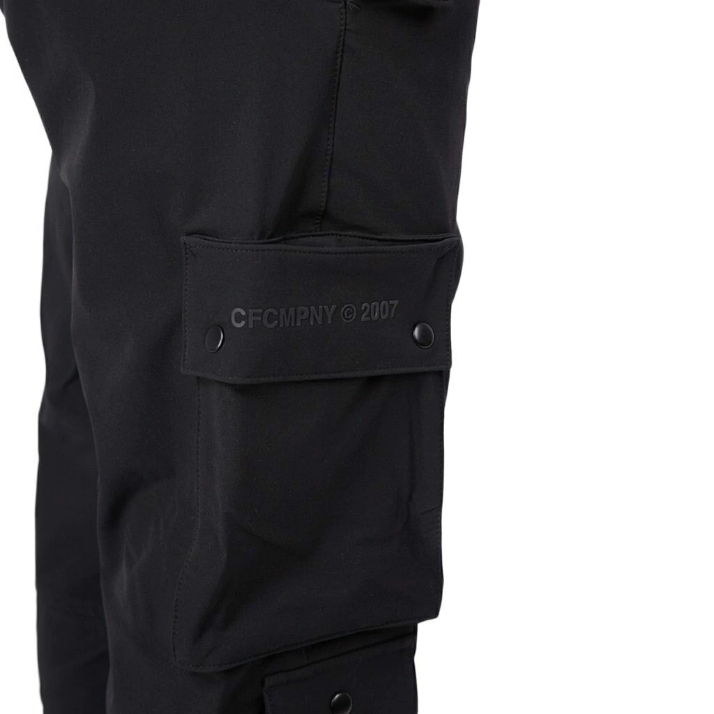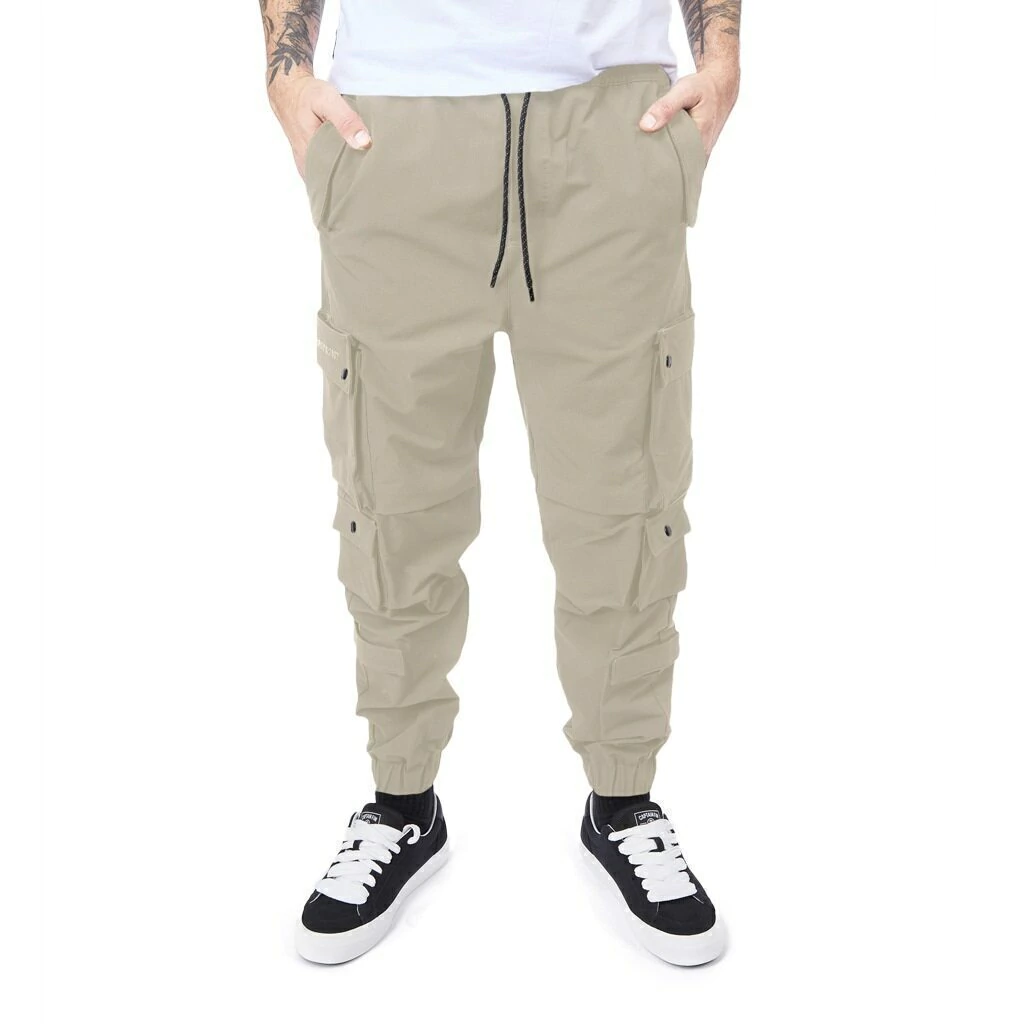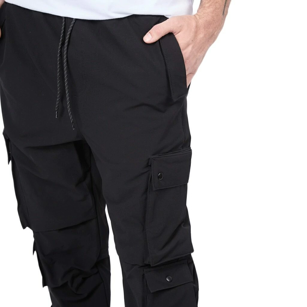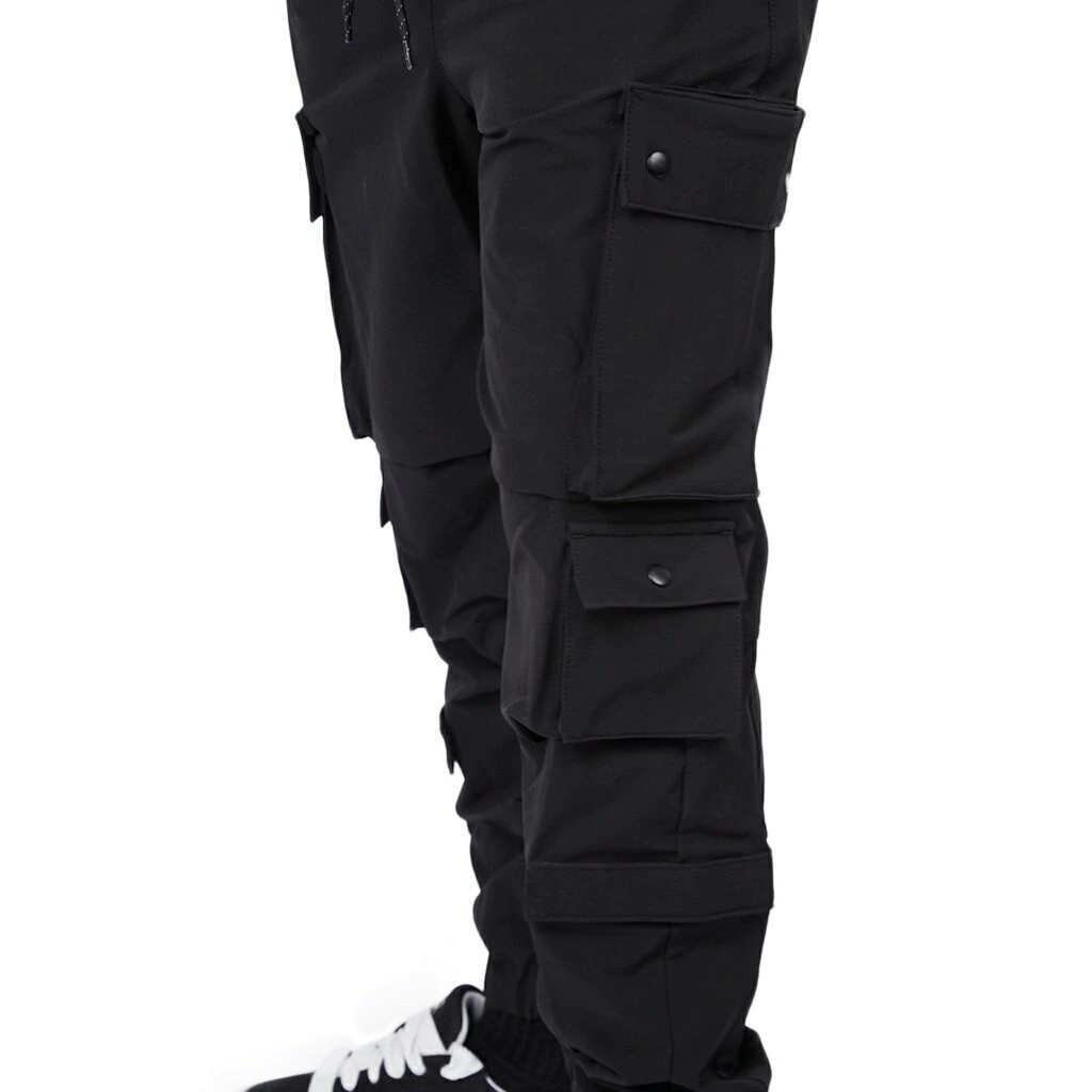 Pantalón jogger cargo técnico. Cintura con elástico regulable con cordón reflectivo, ojales metálicos personalizados, bolsillos laterales delanteros con detalle de velcro, bolsillos cargo en ambas piernas con botones snap metálicos. Logo en silicona 3D en bolsillo lateral y espalda. ajuste de pierna con puño.