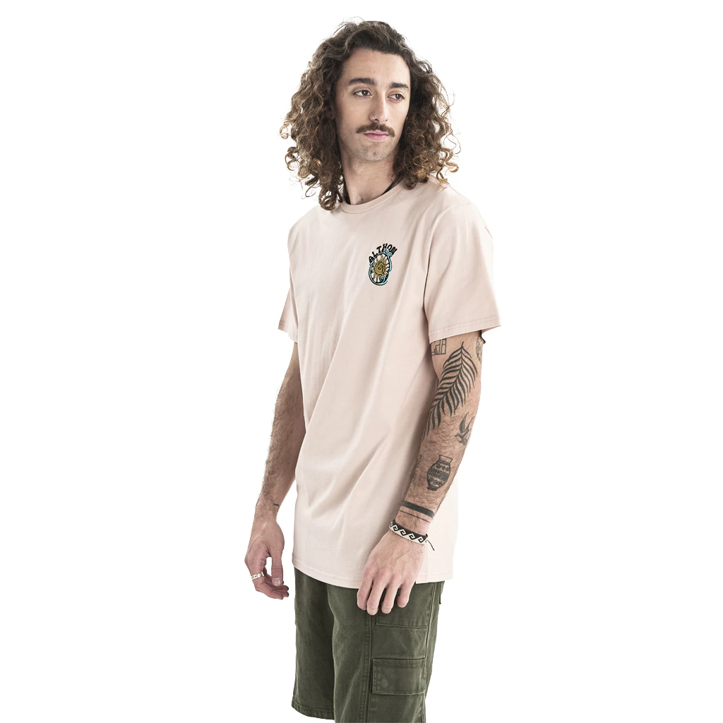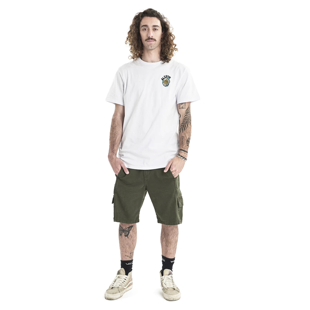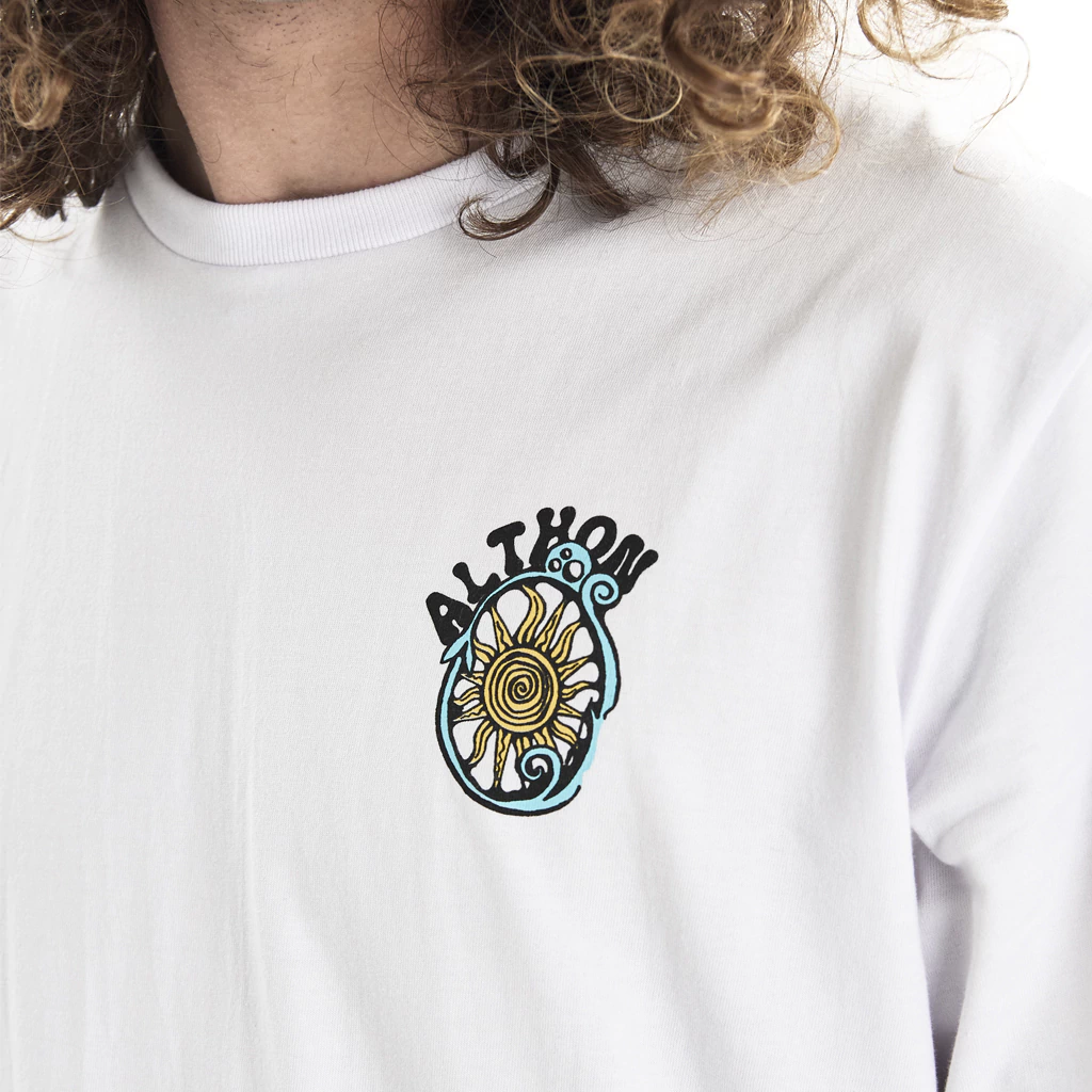 Remera basic fit manga corta con escote aplicado en complemento de ribb. Grifa Althon en ruedo manga izquierda. Estampa logo y espalda 4 colores.