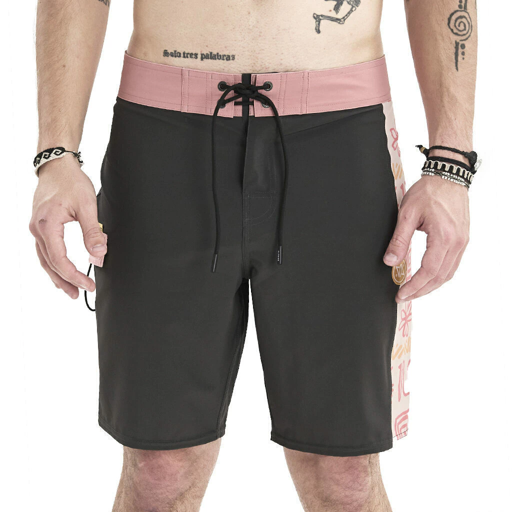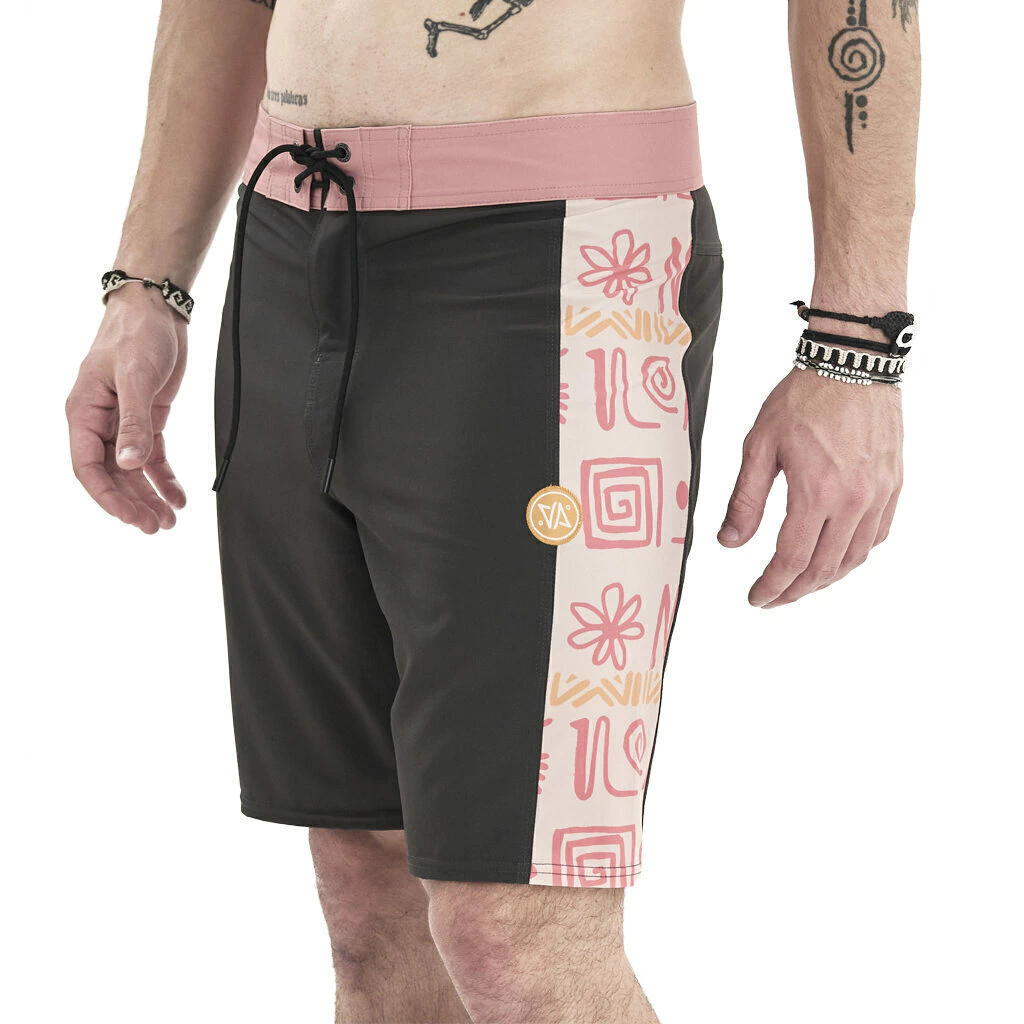 Boardshort straight con cintura plana a contratono. Posee ojalillos personalizados Althon y cordon fantasia con punteras personalizadas.