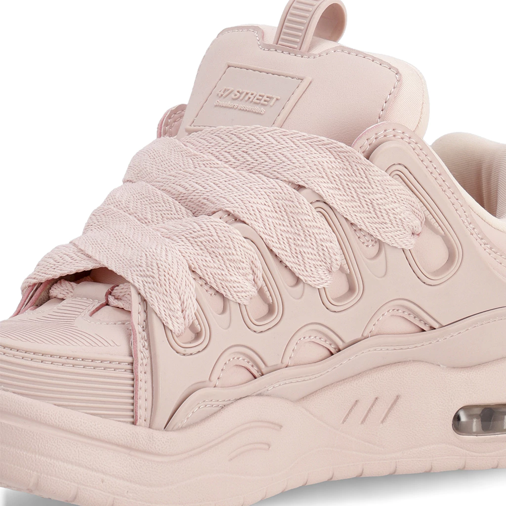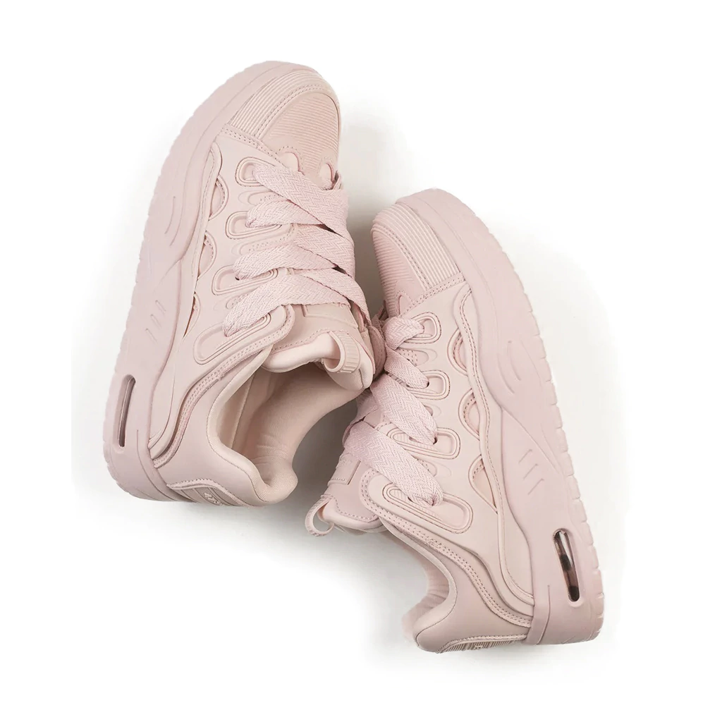 Zapatilla de PU con recortes en goma a tono, con interior de un tejido respirable y lengueta rellena. Acceso mediante cordonera, con cordones anchos de algodón y poliester. Base a tono con camara de aire en el talón.