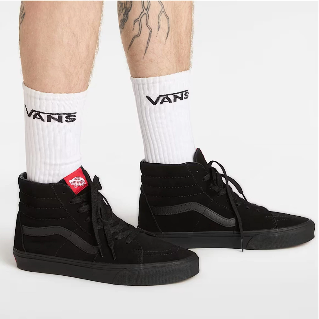 Sk8-Hi surgió como una adaptación del tradicional Old Skool y fue diseñado originalmente para practicar skate. Confeccionada en lona de algodón y tejido de ante, tiene una parte superior más alta y acolchada, aportando más comodidad y firmeza en cada pisada. La entresuela suaviza el impacto y la plantilla se amolda adecuadamente al pie. Las tradicionales correas laterales se aplican a los costados del zapato, mientras que el logotipo Vans Off The Wall se aplica a la lengüeta y la lengüeta del talón. Por último, la suela de goma vulcanizada en forma de gofre con función antideslizante proporciona un mayor agarre al caminar.
